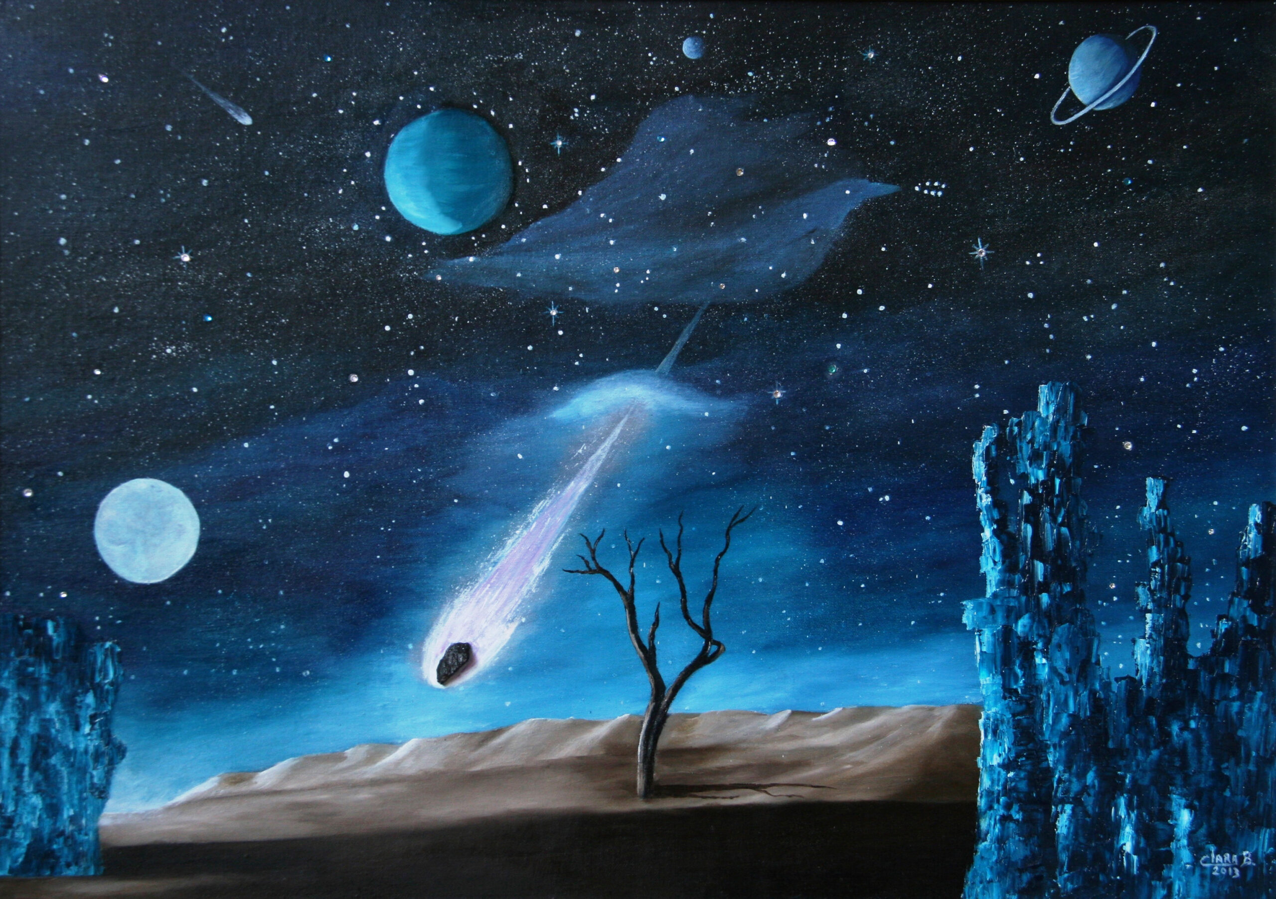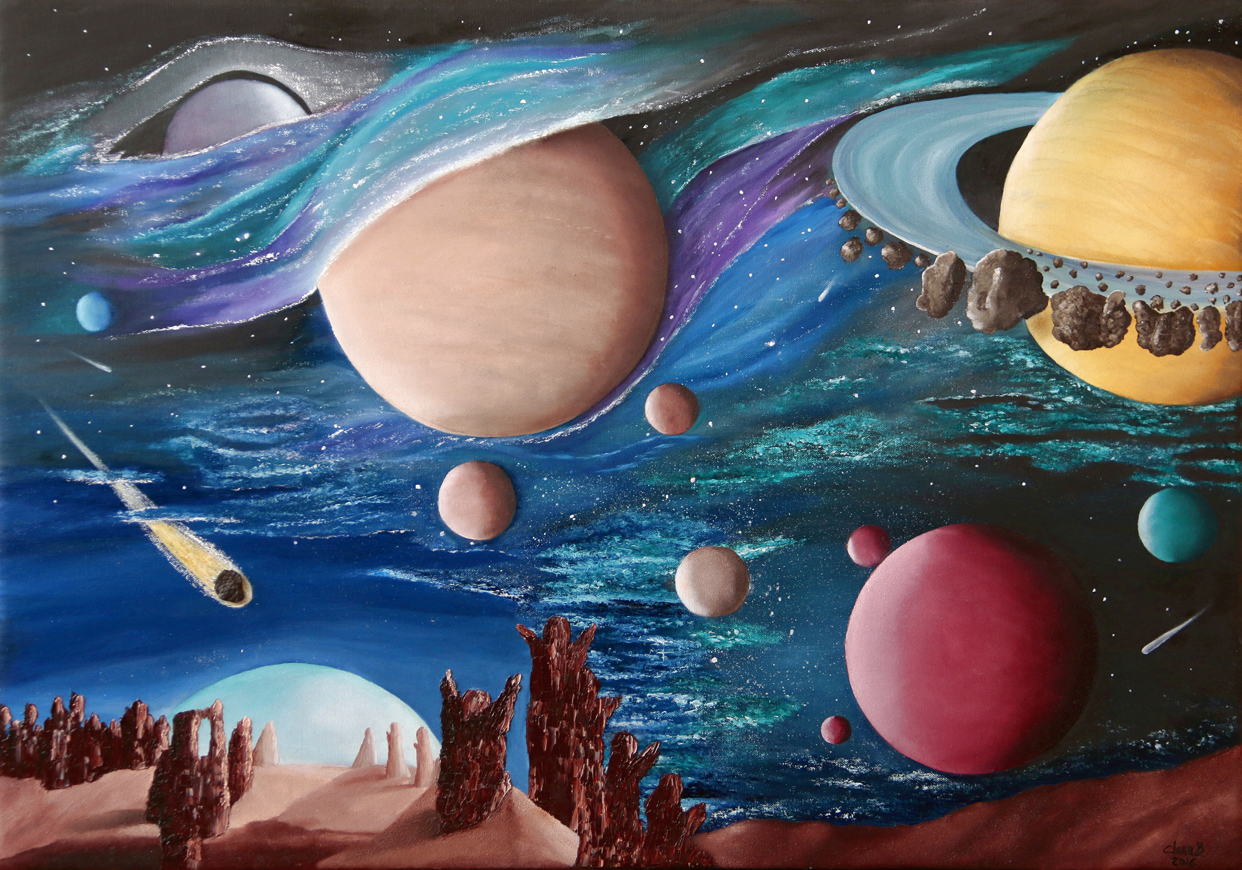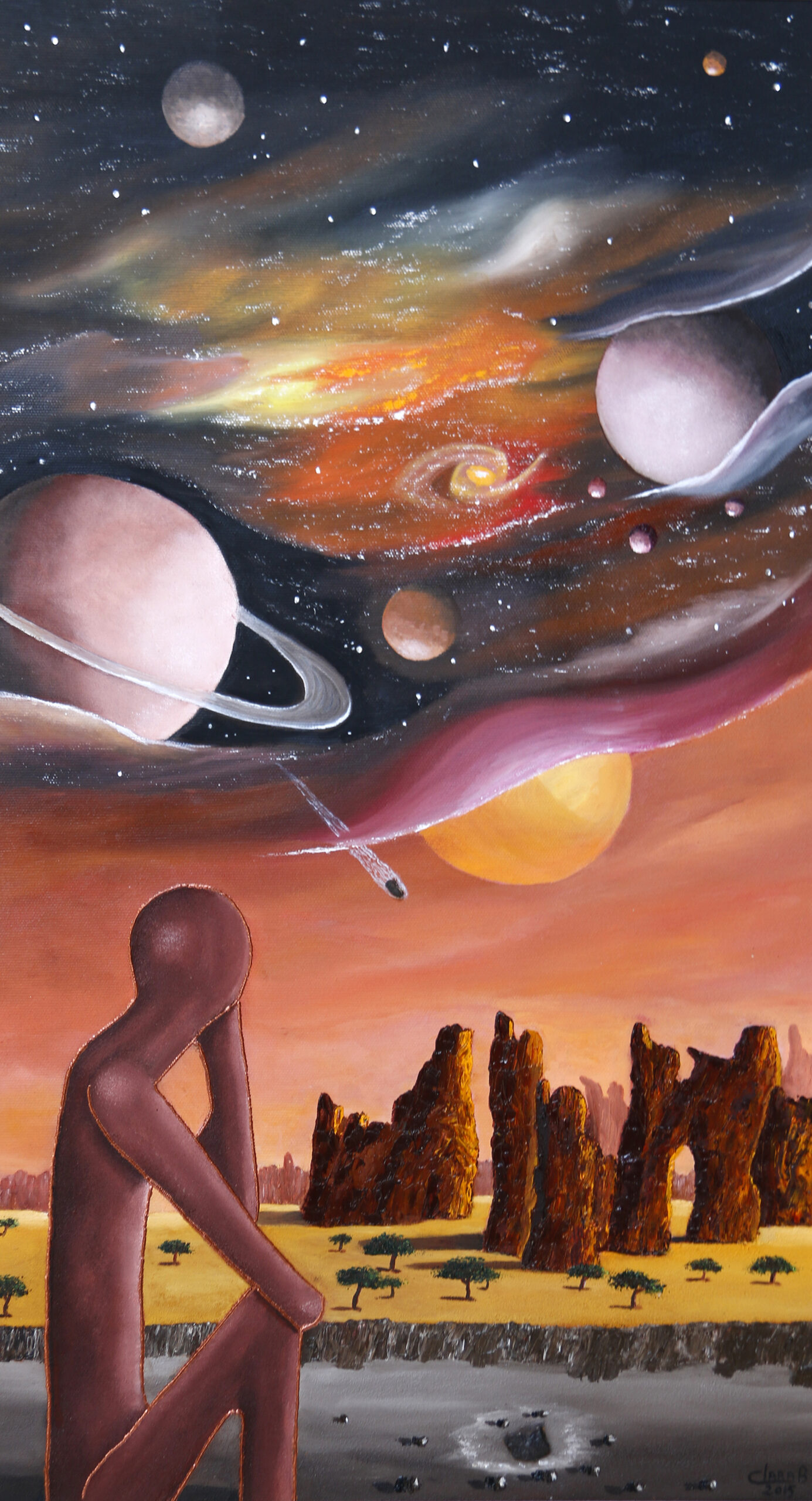 Clara Brunelli was born in Visano (BS), Italy, and has spent most of her life in Calvisano (BS). For several years now, she has been residing in Garda (VR). A former professional photographer and a self-taught painter, Clara is an avid traveler with a special love for the Sahara Desert. Together with her husband, Fabrizio, she has often ventured into this vast landscape in search of meteorites. In fact, many of her artworks include authentic meteorite fragments discovered by the couple in Libya, in November 1999, on a plateau known as Hamada al Hamra. The total weight of the meteorite, which shattered upon impact with the ground, is 30,077.4 grams. It was analyzed at the University of Siena and officially registered by The Meteoritical Society under the classification H5/6, named HAH 296. This is an ordinary chondrite meteorite, with an approximate age of over 4.5 billion years, believed to have fallen to Earth a few hundred years ago. Clara began incorporating meteorite fragments into her artworks at the end of 2010, launching a themed series titled: “From the Infinite to the Earth: Journey of a Meteorite”. Through oil paintings enriched with pieces of that ancient cosmic stone, she narrates the journey of this celestial object—traveling through nebulas, galaxies, planets, and constellations—before landing in the desert where she eventually found it. There is nothing random in Clara’s paintings. Each landscape, each color, and each atmosphere stems from her personal experiences, emotions, and memories. She loves the Sahara, she loves meteorites, and as a result, she has fallen in love with the very place they came from. Driven by a deep curiosity about the cosmos, Clara developed a unique approach to portraying it—an artistic vision that diverges from scientific conventions and instead follows her own interpretive system. This gave birth to what she defines as: “Cosmicism” Cosmicism refers to a pictorial style and/or philosophical tendency in which astronomical and cosmological elements dominate the composition. These may include the curvature of large-scale space, spacetime, galaxies, cosmic orbits, meteorite presence, and more. In this artistic expression of physical reality through color and form, the human being is present—but only in spirit. What remains is the emotional response: the awe of gazing at a star-filled sky or the wonder of holding a meteorite in one’s hand—a stone that carries the message of a fossilized, ancient space. This space is not only universal in scale but also represents the intimate foundation of who we are, as inhabitants of Earth. Life on Earth may well have originated thanks to a meteorite. And in any case, the elements that make up both meteorites and ourselves are the very materials the universe has been creating through stars since the beginning of time. — Dr. Romano Serra Department of Physics, University of Bologna. Clara Brunelli’s work stands out for its pictorial intensity, where bold colors and emotional depth converge. Her decisive palette creates a dynamic interplay on the canvas, shaping a distinctive visual language that never loses sight of its symbolic and conceptual substance. Her cosmic visions evoke a world of profound suggestion, born from a deeply personal exploration. Brunelli maintains a living, ongoing dialogue with her creations, which become tangible expressions of an inner world projected into the vastness of space. The atmosphere in her pieces, infused with a sense of cosmic mystery, draws the viewer into an active role within her artistic journey. Her oil-on-canvas technique is solid and assured, enriched by masterful use of chiaroscuro that enhances the expressive power of light. The inclusion of real meteorite fragments adds a physical and almost ritualistic dimension to her art, blending earthly material with astral inspiration. In the “METEORITE” series, the artist develops a rich and coherent visual language, capable of conveying deep emotions through images of powerful narrative force. Color, a foundational element in her work, is used with deliberate intensity, playing a key role in defining the identity of her compositions. Clara Brunelli’s painting blends intimacy and universality, where each visual element reflects a deep emotional experience. In her “SUPERNOVA AND COSMIC LIGHTS” series, she explores digital techniques to create glowing effects and vivid contrasts, expanding her artistic language.