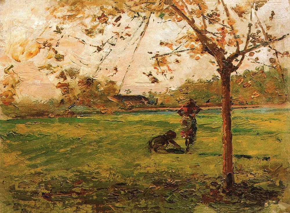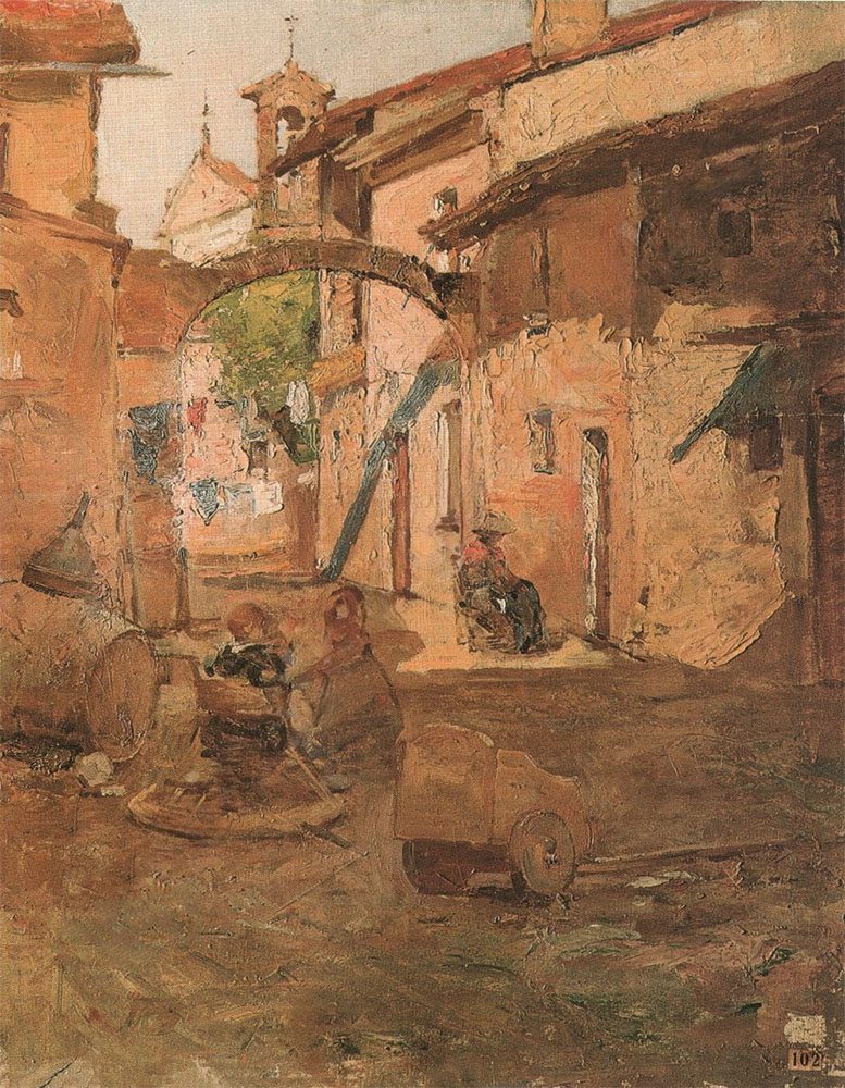 Ezechiele Acerbi (Pavia, 1850 – 1920) was born into a humble family and was the grandson of the Pavia painter Pasquale Massacra. Showing an early aptitude for drawing and painting, he began attending the Civic School of Painting in Pavia at the age of sixteen. There, he studied under Giacomo Trécourt, the director of the institution, and became one of his favored students. During his academic years, Acerbi won several prizes, particularly for historical and genre paintings. In the early 1880s, Acerbi moved to Milan, where he earned a living by teaching painting to the children of aristocratic families. He also painted small portraits and scenes on fans, catering to the demands of the market. After this brief Milanese period, he returned to Pavia in 1888. It was during this time that his artistic style matured: his work began to break free from the academic influences of Trécourt, and he increasingly focused on intimate urban and rural landscapes of the Pavia region. Color, applied with intensity and speed, became a key element of his style, both constructively and illustratively. It played a central role in his ability to communicate quickly and vividly, enriching both his figures and his landscapes. Despite ongoing financial difficulties, which forced him to take on various jobs such as portraitist, itinerant photographer, and illustrator, Acerbi continued to paint with passion and dedication throughout his life. He regularly exhibited his works in Pavia, Milan, and Turin, and several of his paintings are preserved in the Civic Museums of Pavia. He died in Pavia in 1920.