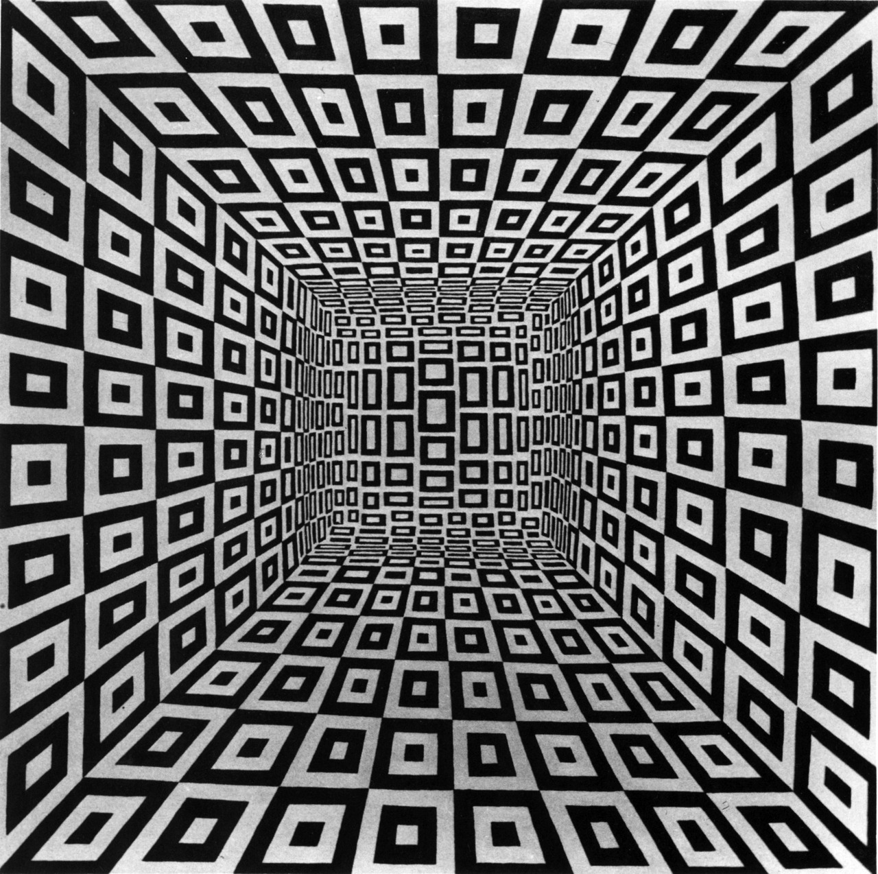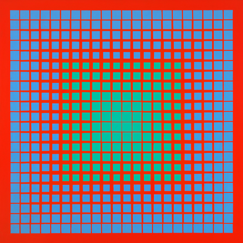 Joseph Anuszkiewicz (born May 23, 1930, Erie, Pennsylvania – died May 19, 2020, Englewood, New Jersey) was an American painter and a pioneering figure in the development of Op Art, a movement focused on the exploration of visual perception and optical illusions. Anuszkiewicz studied at several institutions, including the Cleveland Institute of Art (1948–53), the Yale University School of Art and Architecture (1953–55), and Kent State University, where he earned a B.S. in Education in 1956. In 1967, he was named artist-in-residence at Dartmouth College in Hanover, New Hampshire, and later taught at the University of Wisconsin, Cornell University, and Kent State University, sharing his expertise in the field of visual arts. Anuszkiewicz’s work is known for its bold use of color and intricate geometric patterns. His paintings feature precise, tightly organized shapes and vibrant hues that create a sense of movement and optical tension. One of his notable works, *All Things Live in the Three* (1963), features three orange diamonds with green dots on a red background, interspersed with blue dots and red patterns inside the diamonds—an example of his characteristic exploration of color relationships and the visual effects they produce.